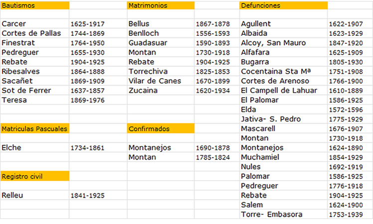 En diócesis de Orihuela-Alicante: Confirmados, dispensas, clausulas testamentarias, racionales y expedientes de matrimonio hay más de 19.490 registros de matrimonios de la zona, como, por ejemplo, Santa Pola, Crevillente, Elche, Aspe etc….